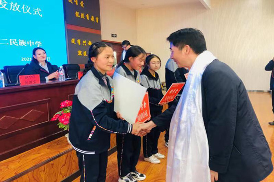 4月8日,福建公司福州分公司在青海省尖扎县第二民族中学开展助学共建仪式。这是该公司连续两年为尖扎县第二民族中学扶特困生发放助学金。