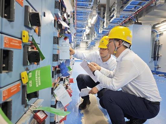 首批高级操纵员王其威监护现场操纵员开展A列配电盘复役工作。摄/黄钰坤
