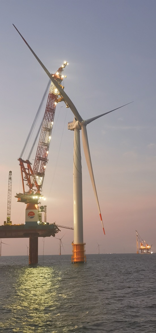 研发过程:大型风电机组的开发充满困难,虽然风电机组容量仅从7兆瓦升至11兆瓦,但容量增加带来的是立方级别的工作载荷提升,大大增加了风电机组叶片、轴承、支撑结构的运行压力。项目团队自主开发海上风电仿真与建模关键技术,成功突破了大型风电机组叶片、轴承、支撑结构等部件的设计制造方法,用更少的材料为海上风电机组打造更强壮的“骨架”,保障了11兆瓦国产化海上风电机组的顺利研制。