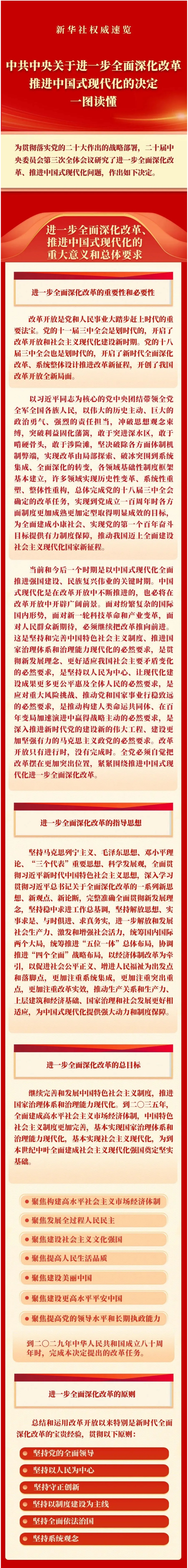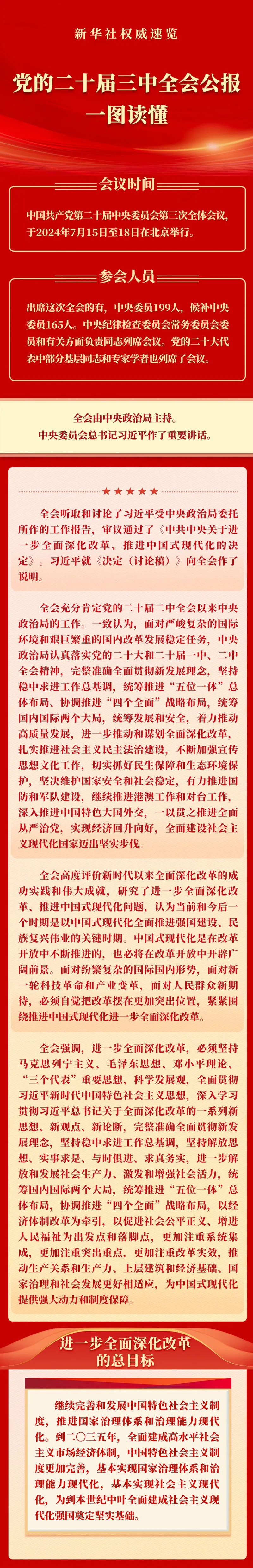 中共中央关于进一步全面深化改革 推进中国式现代化的决定 (2024年7月18日中国共产党第二十届中央委员会第三次全体会议通过) 为贯彻落实党的二十大作出的战略部署,二十届中央委员会第三次全体会议研究了进一步全面深化改革、推进中国式现代化问题,作出如下决定。